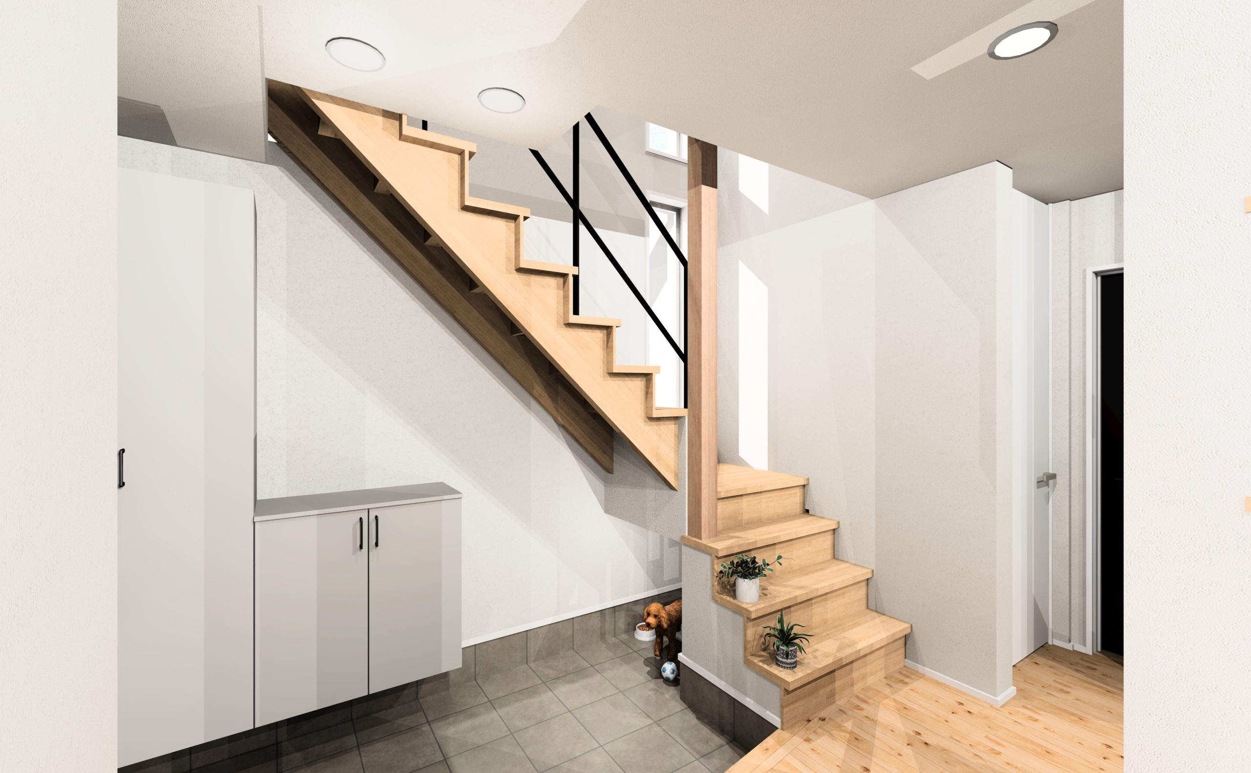 玄関ホールには階段下を活用してわんちゃんのおうちに。