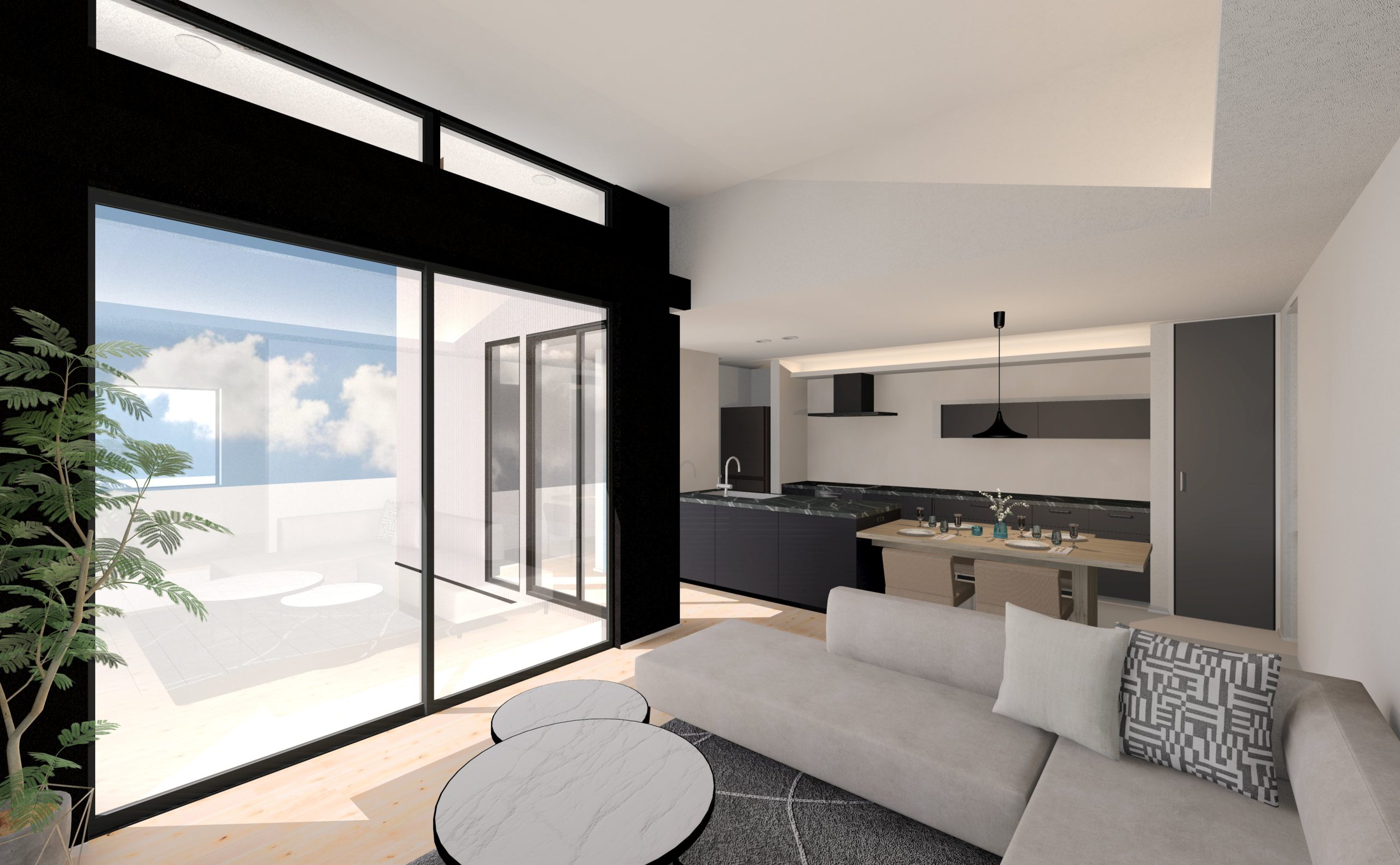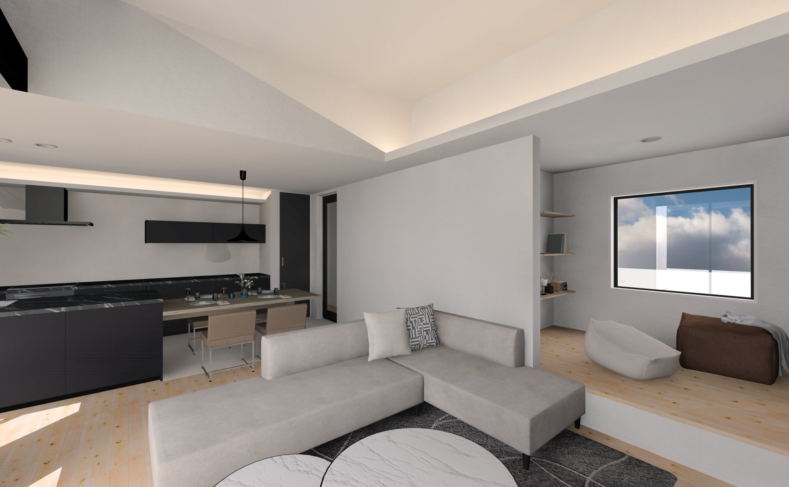 約19帖のLDKは高天井のリビングにすることで実際よりも広く感じます。