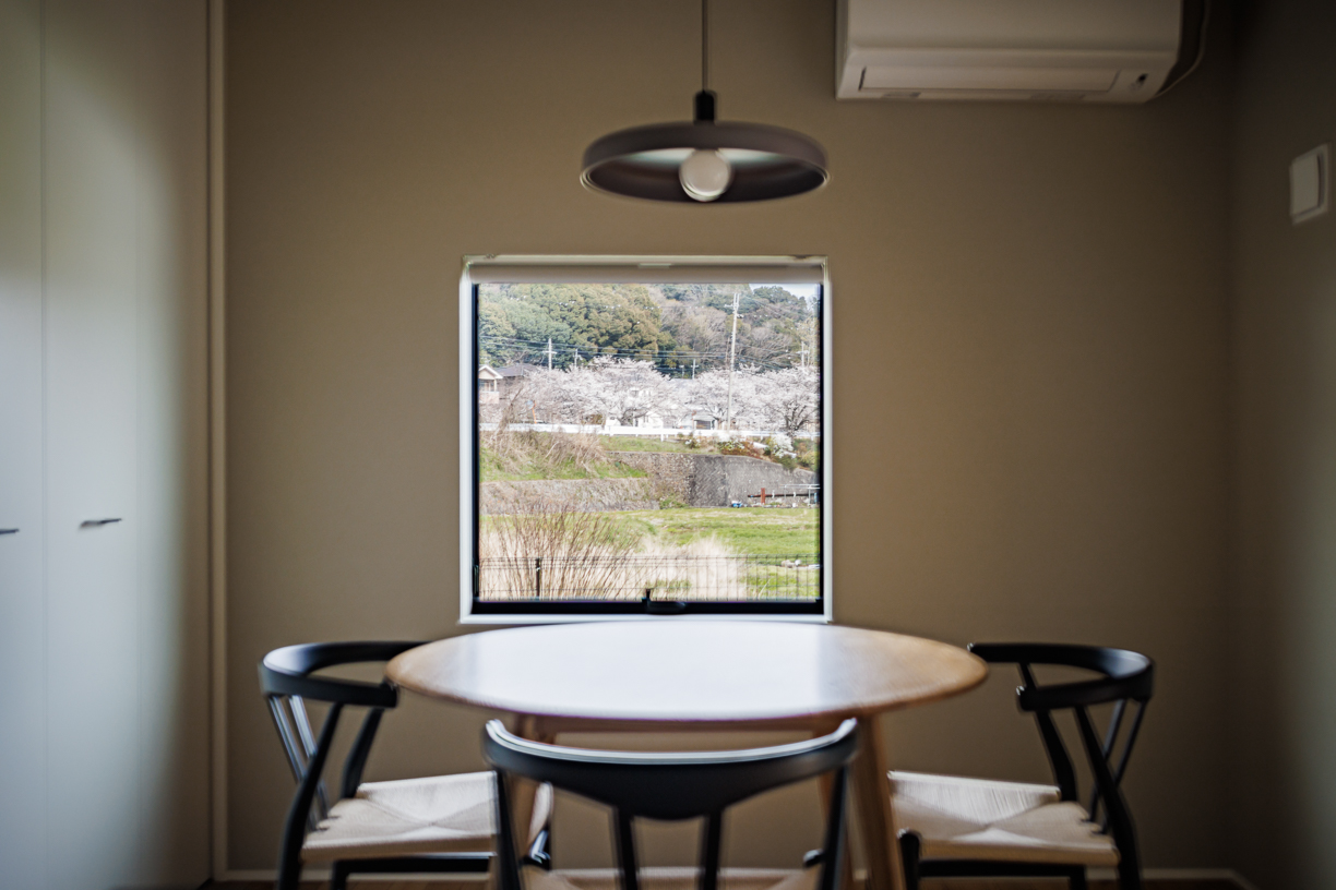 ▼春にはダイニングから桜の並木道が見えます。お施主様お気に入りの景色です。