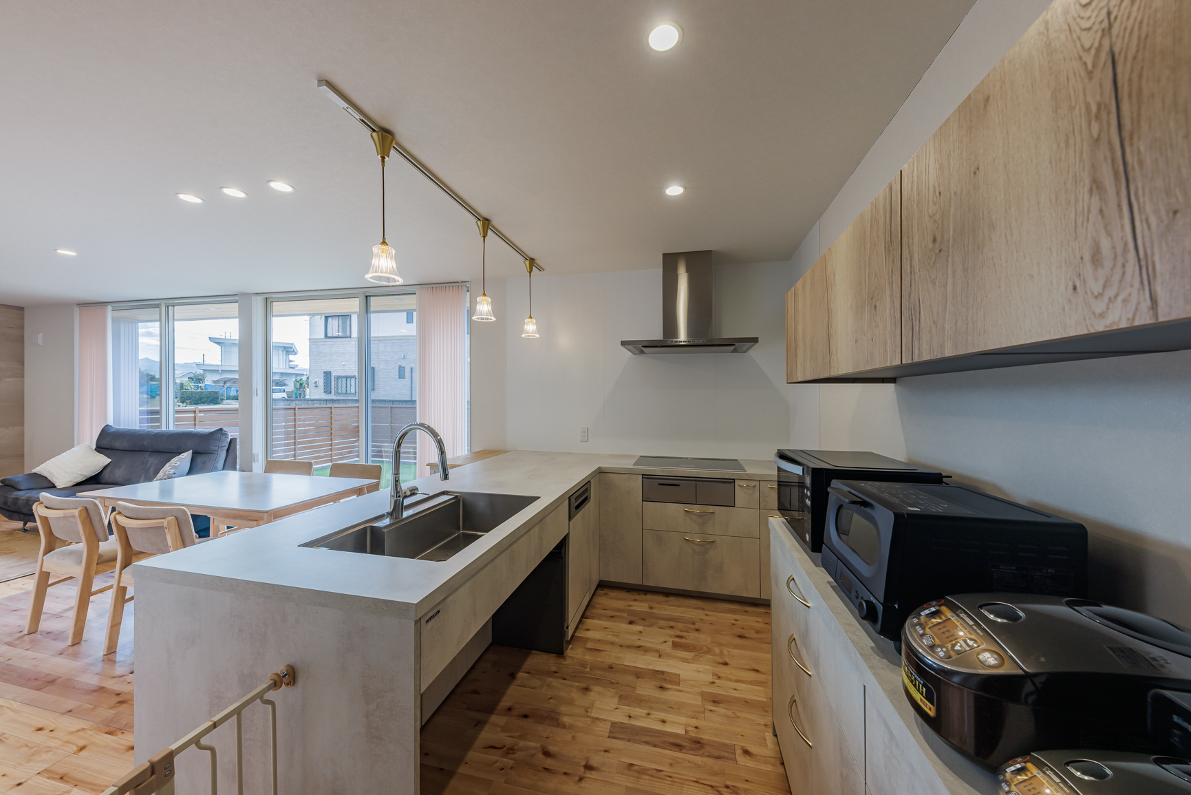 子供のお宮参りのあと、両家揃ってここでご飯食べたんですけど、L字で調理スペースの部分が広いので料理したらすぐ出せるみたいな、なんならもうここに置いてビュッフェ形式みたいなこともできたし、すごく使い勝手がいいです。