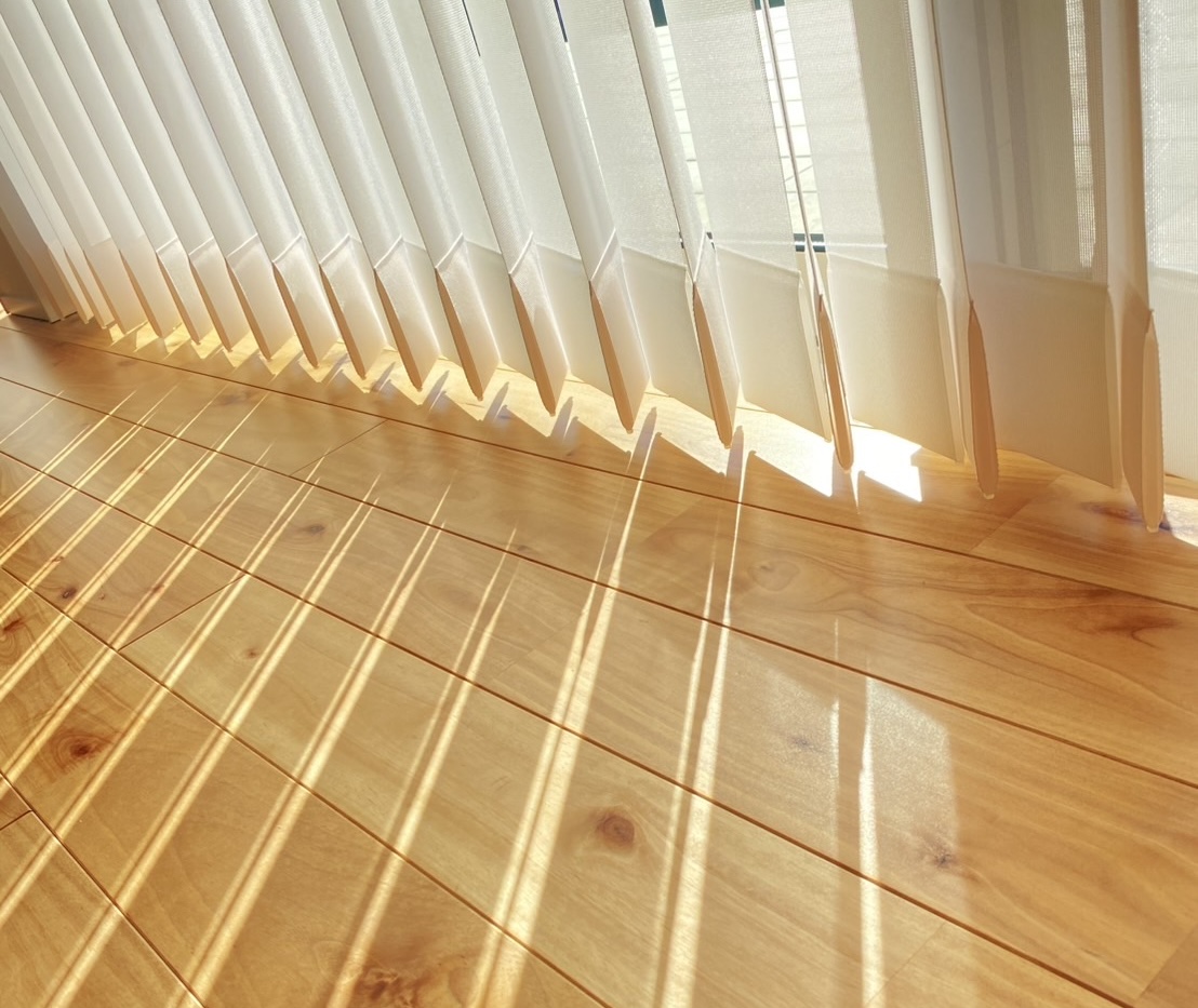 このバーチカルブラインドも今西先生が提案してくれて。このお家にはすっきりした感じがいいと思うからってこんなカーテンもあるよって。めっちゃ気に入ってます!この縦の光の影が床に反射するのが、無垢の床との相性もよくて、すごく綺麗なんです。